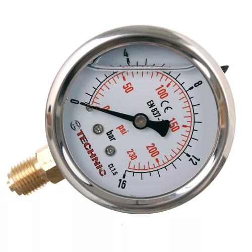 Glicerin csillapítású manométer, 0-16 bar, 1/4" alsó csatlakozással