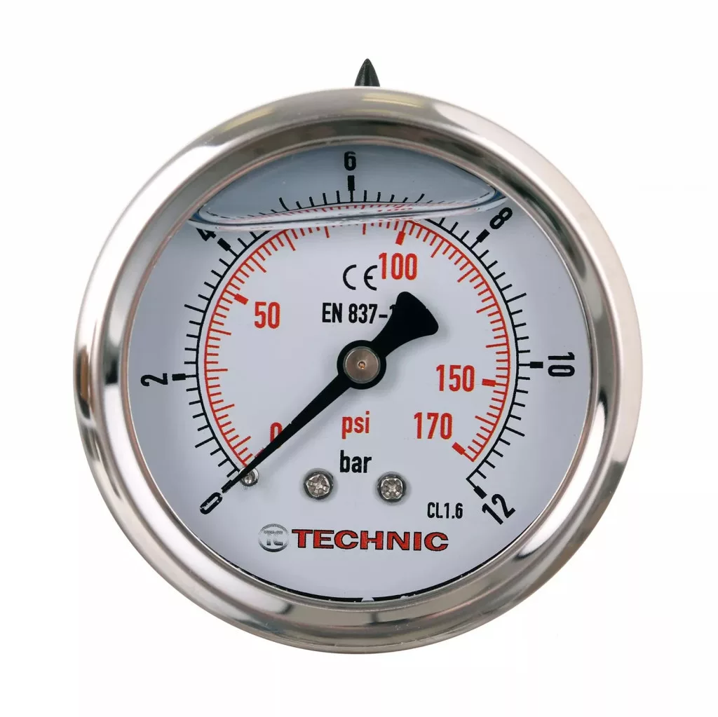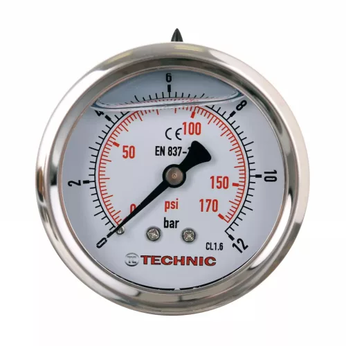 TC Technic Glicerines Nyomásmérő ideális precíz nyomásmérésre ipari és hidraulikus rendszerekben, szakemberek és karbantartók számára. Strapabíró acél burkolata és glicerines működése hosszú távon biztosítja a megbízhatóságot és pontosságot, csökkentve a vibráció hatását.